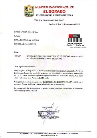 Registro de denuncias ambientales del año 2020 ( ene - set) de la Municipalidad provincial EL Dorado