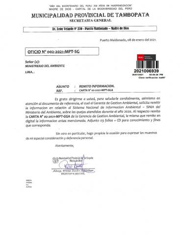 Registro de denuncias ambientales correspondientes al año 2020 de la Municipalidad Provincial de Tambopata