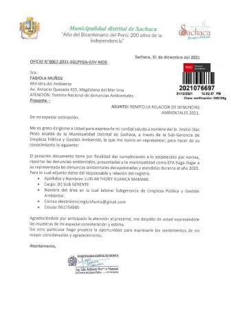 Relación de denuncias ambientales 2021 de la Municipalidad distrital de Sachaca