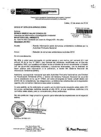 RELACION DE DENUNCIAS AMBIENTALES RECIBIDAS POR LA AUTORIDAD PORTUARIA NACIONAL AÑO 2018