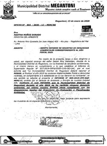 RemInforme de registro de denuncias ambientales correspondientes al año fiscal 2019 Municipalidad Distrital Megantoni