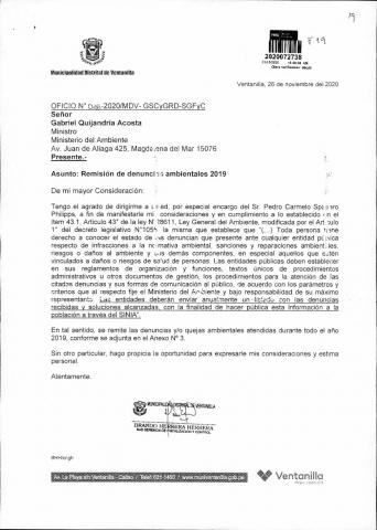 Remisión de denuncias ambientales 2019 de la Municipalidad Distrital de Ventanilla