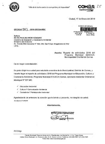 Y de acuerdo al instructivo para elaborar e implementar del Programa Municipal de EDUCCA (Resolución Ministerial N°456- 2018- MINAM), la Municipalidad Distrital de Comas remite al MINAM las actividades desarrolladas el 2018 en el marco del Programa Municipal EDUCCA-COMAS aprobado mediante Ordenanza Municipal N° 531/MC del 15 de enero del 2018.