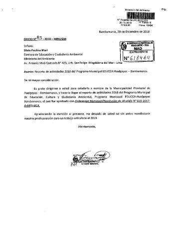 Y de acuerdo al instructivo para elaborar e implementar del Programa Municipal de EDUCCA (Resolución Ministerial N°456- 2018- MINAM), la Municipalidad Provincial de Hualgayoc remite al MINAM las actividades desarrolladas el 2018 en el marco del Programa Municipal EDUCCA- Hualgayoc aprobado con Resolución de Alcaldía N° 015-2017-A-MPH-BCA el 04 de setiembre del 2017.