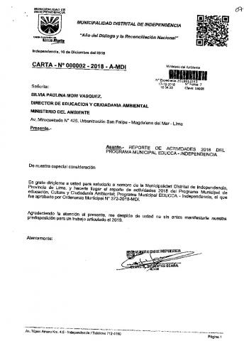 Y de acuerdo al instructivo para elaborar e implementar del Programa Municipal de EDUCCA (Resolución Ministerial N°456- 2018- MINAM), la Municipalidad Distrital de Independencia remite al MINAM las actividades desarrolladas el 2018 en el marco del Programa Municipal EDUCCA-INDEPENDENCIA aprobada mediante Ordenanza N° 372-2017-MDI de fecha 29 de diciembre 2017