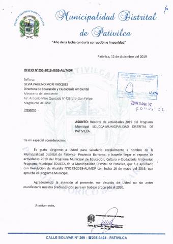 Y de acuerdo al instructivo para elaborar e implementar del Programa Municipal EDUCCA (Resolución Ministerial N°456- 2018- MINAM), la Municipalidad Distrital de Pativilca- Barranca remite al MINAM las actividades desarrolladas el 2019 en el marco del Programa Municipal EDUCCA- Pativilca- Barranca aprobado con Resolución de Alcaldía N° 0173-2019-AL/MDP del 16 de mayo del 2019.