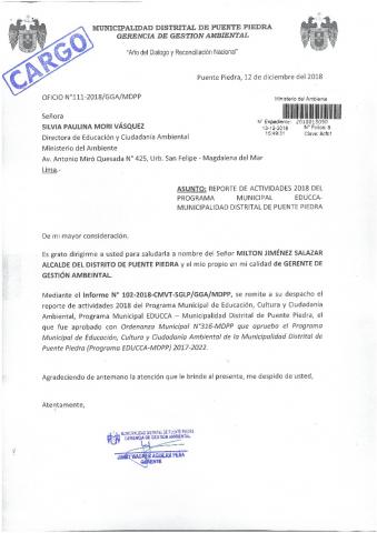 Y de acuerdo al instructivo para elaborar e implementar del Programa Municipal de EDUCCA (Resolución Ministerial N°456- 2018- MINAM), la Municipalidad Distrital de Puente Piedra remite al MINAM las actividades desarrolladas el 2018 en el marco del Programa Municipal EDUCCA-PUENTE PIEDRA aprobado mediante Ordenanza Municipal N° 316-MDPP de fecha 08 de agosto del 2017