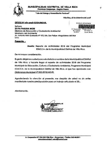 Y de acuerdo al instructivo para elaborar e implementar del Programa Municipal de EDUCCA (Resolución Ministerial N°456- 2018- MINAM), la Municipalidad Distrital de Villa Rica remite al MINAM las actividades desarrolladas el 2018 en el marco del Programa Municipal EDUCCA- Villa Rica aprobado con Ordenanza Municipal N° 002-2018/MDVR el 19 de enero del 2018.