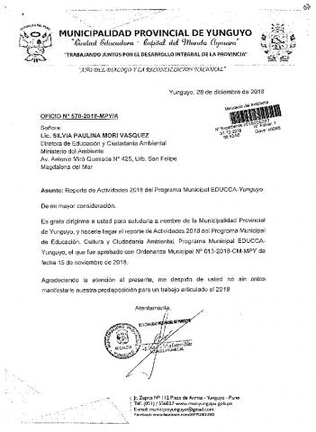 Y de acuerdo al instructivo para elaborar e implementar del Programa Municipal de EDUCCA (Resolución Ministerial N°456- 2018- MINAM), la Municipalidad Provincial de Yunguyo remite al MINAM las actividades desarrolladas el 2018 en el marco del Programa Municipal EDUCCA- Yunguyo aprobado con Ordenanza Municipal N° 013-2018-CM-MPY el 15 de noviembre del 2018.