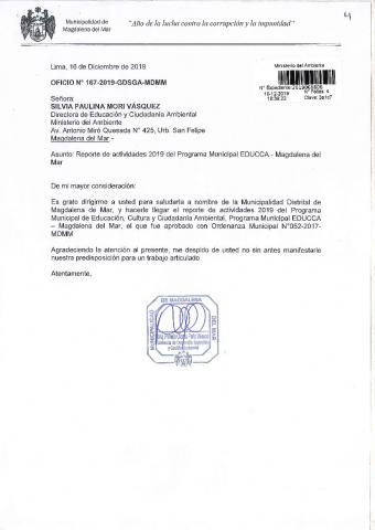 De acuerdo al instructivo para elaborar e implementar el Programa Municipal EDUCCA (Resolución Ministerial N°456- 2018- MINAM), la Municipalidad Distrital de Magdalena del Mar, remite al MINAM las actividades desarrolladas durante el 2019 en el marco del Programa Municipal EDUCCA.