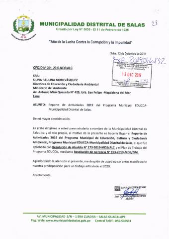 Y de acuerdo al instructivo para elaborar e implementar del Programa Municipal EDUCCA (Resolución Ministerial N°456- 2018- MINAM), la Municipalidad Distrital de Salas- Ica remite al MINAM las actividades desarrolladas el 2019 en el marco del Programa Municipal EDUCCA- Salas- Ica aprobado con Resolución de Alcaldía N° 173- 2019 MDS/GM del 22 de mayo del 2019.