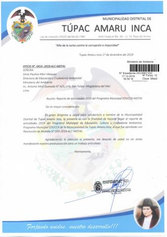Y de acuerdo al instructivo para elaborar e implementar del Programa Municipal EDUCCA (Resolución Ministerial N°456- 2018- MINAM), la Municipalidad Distrital de Túpac Amaru Inca- Pisco remite al MINAM las actividades desarrolladas el 2019 en el marco del Programa Municipal EDUCCA- Túpac Amaru Inca- Pisco aprobado con Resolución de Alcaldía N° 033-2019-ALC-MDTAI del 22 de enero del 2019.