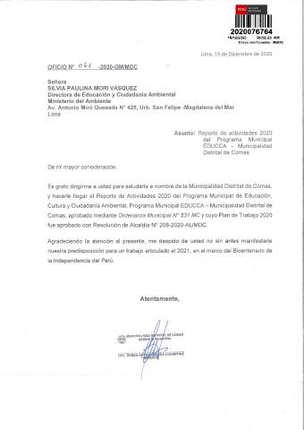 De acuerdo al instructivo para elaborar e implementar el Programa Municipal EDUCCA (Resolución Ministerial N°456- 2018- MINAM), la Municipalidad Distrital de Comas, remite al MINAM las actividades desarrolladas durante el 2020 en el marco del Programa Municipal EDUCCA.