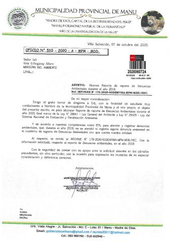 Reporte de denuncias ambientales 2019 de la Municipalidad Provincial de Manu