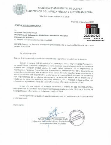 Reporte de denuncias ambientales presentadas ante la Municipalidad Distrital de la Brea durante el 2019