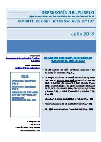 El reporte de conlictos sociales es un instrumento de monitoreo cuyo objetivo es informar mensualmente acerca de los actores, los problemas y el desarrollo de los conflictos sociales registrados por la Defensoría del Pueblo a nivel nacional.La información divulgada constituye una señal de alerta dirigida al Estado, las empresas, las dirigencias de las organizaciones sociales, los medios de comunicación y la sociedad en general a fin de que se tomen decisiones orientadas a conducir el conflicto por la vía de la ley y el diálogo, y se eviten los desenlaces violentos. El documento recoge la información proporcionada por los actores intervinientes en los conflictos sociales, a través de las 28 oficinas defensoriales y los 10 módulos de atención al público que tiene la institución, complementada y contrastada con otras fuentes.