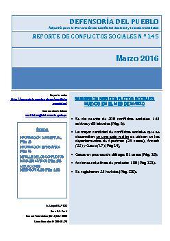 El reporte de conflictos sociales es un instrumento de monitoreo cuyo objetivo es informar mensualmente acerca de los actores, los problemas y el desarrollo de los conflictos sociales registrados por la Defensoría del Pueblo a nivel nacional.