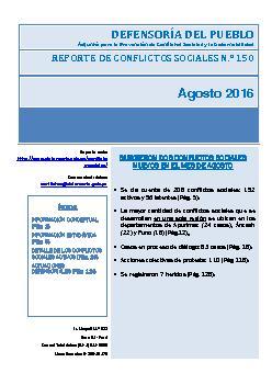 En el mes de agosto surgieron dos conflictos sociales. Se da cuenta de 208 conflictos sociales: 152 activos y 56 latentes. La mayor cantidad de conflictos sociales que se desarrollan en una sola región se ubican en los departamentos de Apurímac (24 casos), Áncash (22) y Puno (18).
