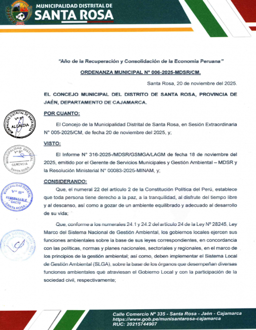 ORDENANZA MUNICIPAL QUE APRUEBA LA ADECUACIÓN DE LA COMISION AMBIENTAL MUNICIPAL (CAM) DEL DISTRITO DE SANTA ROSA DE LA PROVINCIA DE JAEN