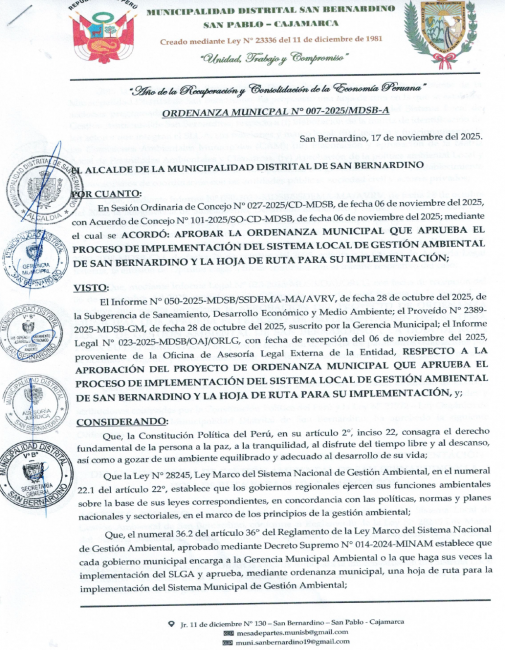ORDENANZA MUNICIPAL QUE APRUEBA EL PROCESO DE IMPLEMENTACIÓN DEL SISTEMA REGIONAL DE GESTION AMBIENTAL DEL DISTRITO DE SAN BERNARDINO -SAN PABLO Y LA HOJA DE RUTA