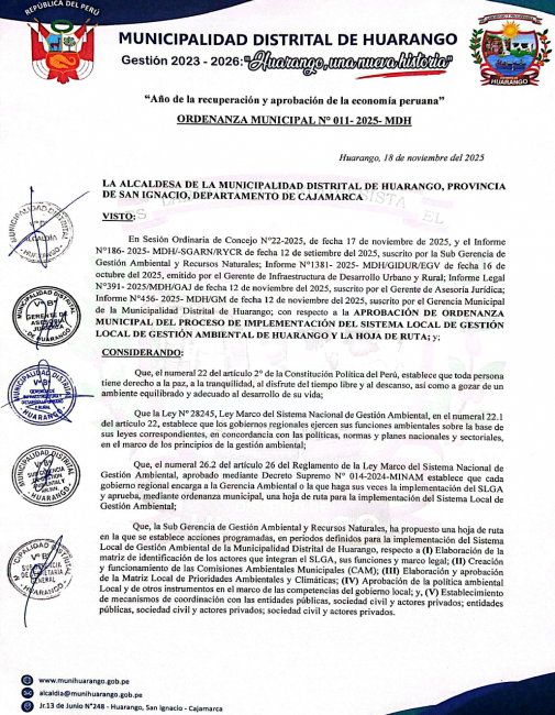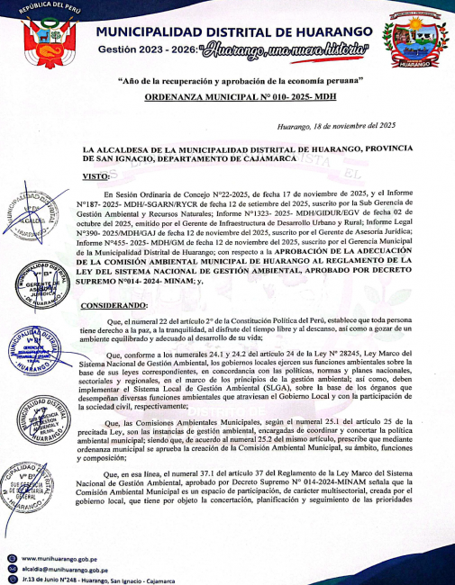 ORDENANZA MUNICIPAL QUE APRUEBA LA ADECUACIÓN DE LA COMISION AMBIENTAL MUNICIPAL (CAM) DEL DISTRITO DE HUARANGO, PROVINCIA DE SAN IGNACIO