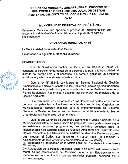 ORDENANZA MUNICIPAL QUE APRUEBA EL PROCESO DE IMPLEMENTACIÓN DEL SISTEMA REGIONAL DE GESTION AMBIENTAL DEL DISTRITO DE JOSE GALVEZ - CELENDIN Y LA HOJA DE RUTA