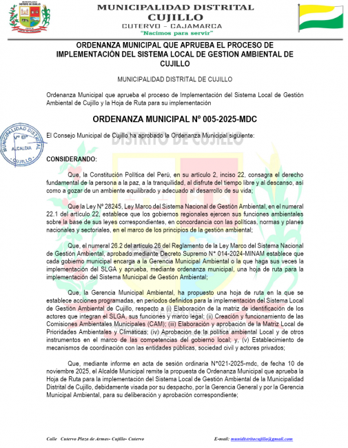 Ordenanza Municipal N° 005-2025-MDC-CUJILLO