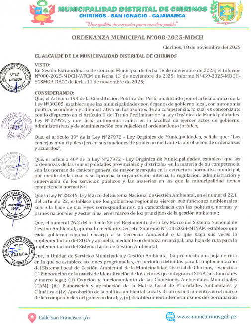 ORDENANZA MUNICIPAL QUE APRUEBA EL PROCESO DE IMPLEMENTACIÓN DEL SISTEMA REGIONAL DE GESTION AMBIENTAL DEL DISTRITO DE CHIRINOS -SAN IGNACIO Y LA HOJA DE RUTA