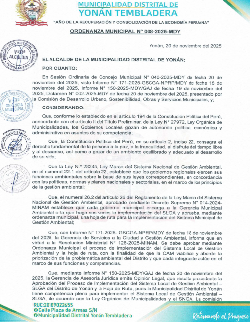 Ordenanza Municipal N° 008-2025-MDY-YONAN