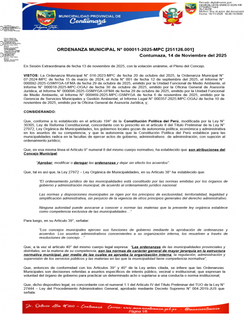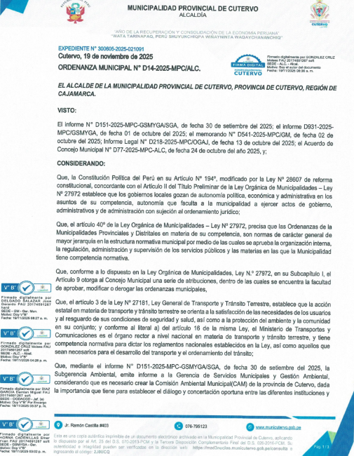 Ordenanza Municipal N° D14-2025-MPC-ALC-CAM