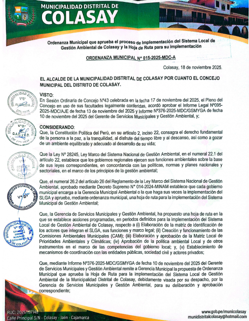 ORDENANZA MUNICIPAL QUE APRUEBA EL PROCESO DE IMPLEMENTACIÓN DEL SISTEMA REGIONAL DE GESTION AMBIENTAL DEL DISTRITO DE COLASAY -JAEN Y LA HOJA DE RUTA