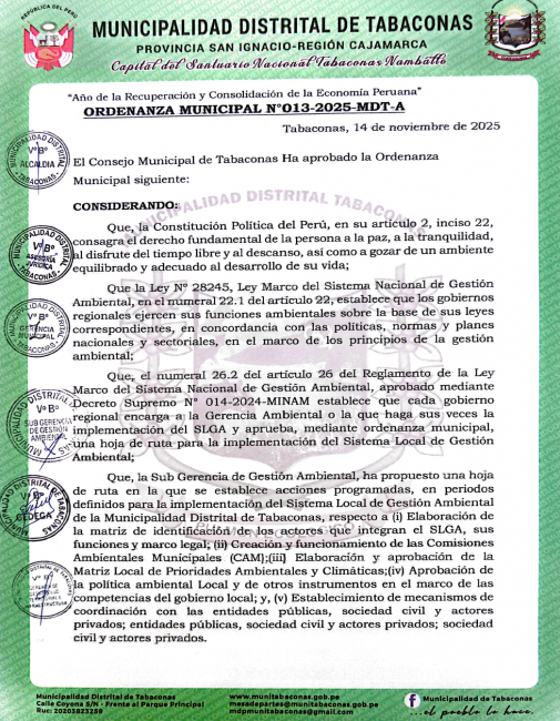 ORDENANZA MUNICIPAL QUE APRUEBA EL PROCESO DE IMPLEMENTACIÓN DEL SISTEMA REGIONAL DE GESTION AMBIENTAL DEL DISTRITO DE TABACONAS -SAN IGNACIO Y LA HOJA DE RUTA