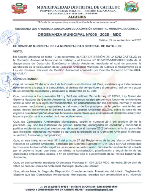 ORDENANZA MUNICIPAL QUE APRUEBA LA ADECUACIÓN DE LA COMISION AMBIENTAL MUNICIPAL (CAM) DE LA MUNICIPALIDAD DISTRITAL DE CATILLUC DE LA PROVINCIA DE SAN MIGUEL