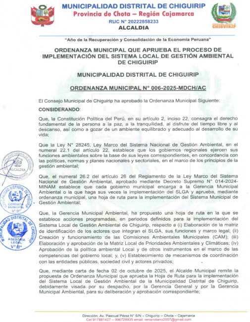 ORDENANZA MUNICIPAL QUE APRUEBA EL PROCESO DE IMPLEMENTACIÓN DEL SISTEMA REGIONAL DE GESTION AMBIENTAL DEL DISTRITO DE CHIGUIRIP -CHOTA Y LA HOJA DE RUTA