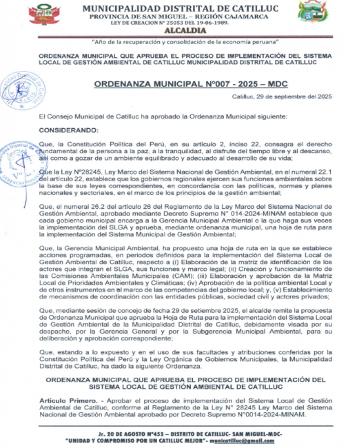 ORDENANZA MUNICIPAL QUE APRUEBA EL PROCESO DE IMPLEMENTACIÓN DEL SISTEMA REGIONAL DE GESTION AMBIENTAL DEL DISTRITO DE CATILLUC -SAN MIGUEL Y LA HOJA DE RUTA
