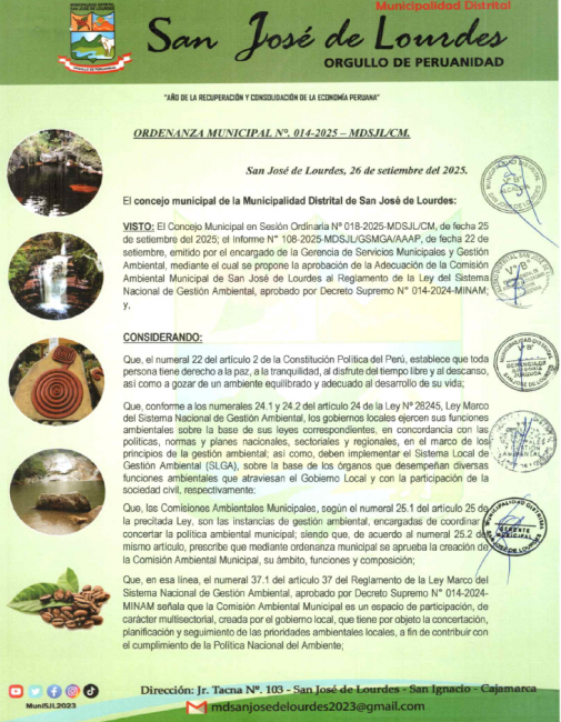 ORDENANZA MUNICIPAL QUE APRUEBA LA ADECUACIÓN DE LA COMISION AMBIENTAL MUNICIPAL (CAM) DEL DISTRITO DE SAN JOSE DE LOURDES-SAN IGNACIO