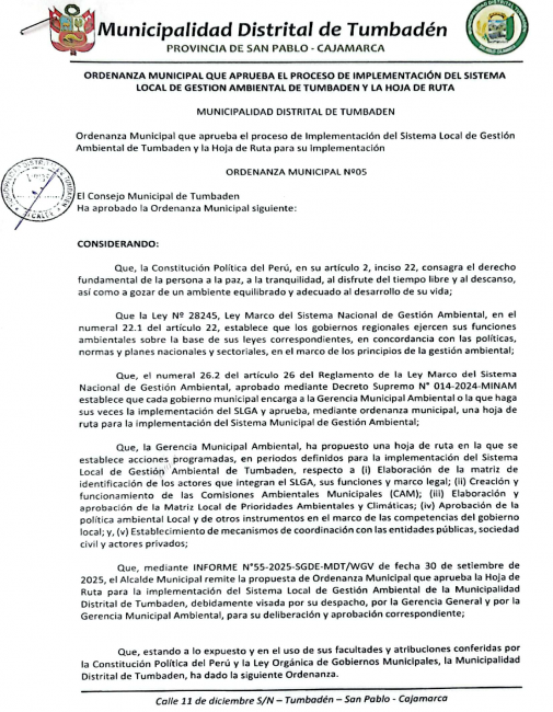 Ordenanza Municipal N° 05-2025 SLGA TUMBADEN