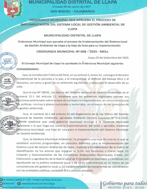 ORDENANZA MUNICIPAL QUE APRUEBA EL PROCESO DE IMPLEMENTACIÓN DEL SISTEMA REGIONAL DE GESTION AMBIENTAL DEL DISTRITO DE LLAPA -SAN MIGUEL Y LA HOJA DE RUTA