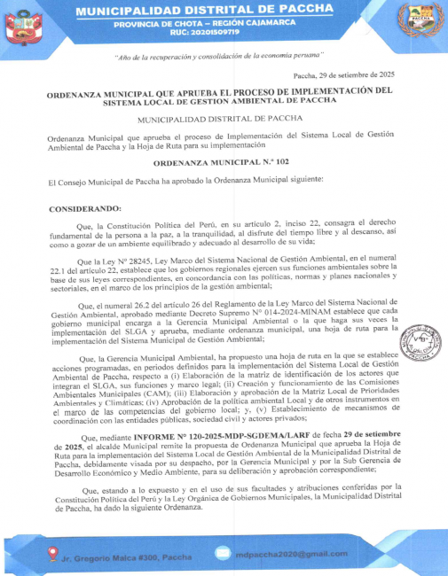 ORDENANZA MUNICIPAL QUE APRUEBA EL PROCESO DE IMPLEMENTACIÓN DEL SISTEMA REGIONAL DE GESTION AMBIENTAL DEL DISTRITO DE LA PACCHA -CHOTA Y LA HOJA DE RUTA