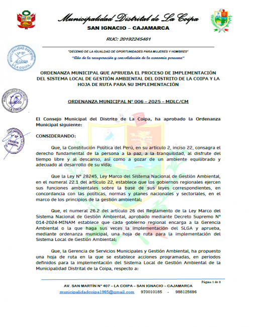 ORDENANZA MUNICIPAL QUE APRUEBA EL PROCESO DE IMPLEMENTACIÓN DEL SISTEMA REGIONAL DE GESTION AMBIENTAL DEL DISTRITO DE LA COIPA - SAN IGNACIO Y LA HOJA DE RUTA