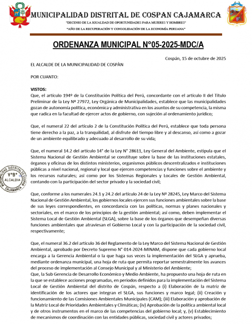 Ordenanza Municipal N° 05-2025-MDC-A(SLGA COSPAN-CAJAMARCA)