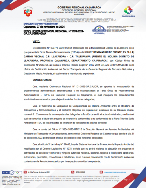 Resolución Gerencial Regional N° D76-2024-GR.CAJ/GRRNGMA