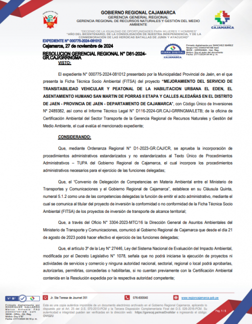 Resolución Gerencial Regional N° D81-2024-GR.CAJ/GRRNGMA