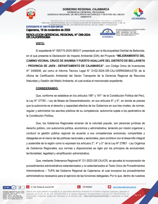 Resolución Gerencial Regional N° D69-2024-GR.CAJ/GRRNGMA