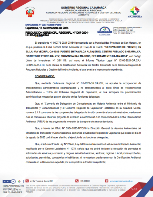 Resolución Gerencial Regional N° D67-2024-GR.CAJ/GRRNGMA