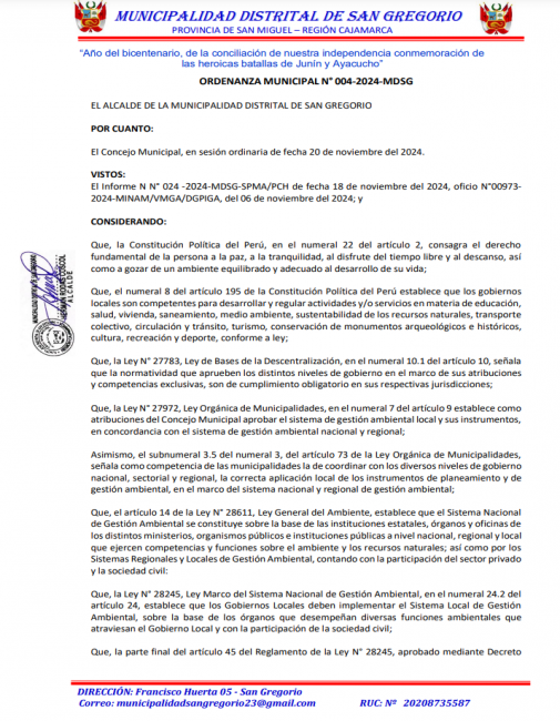 Ordenanza Municipal N° 004-2024-MDSG