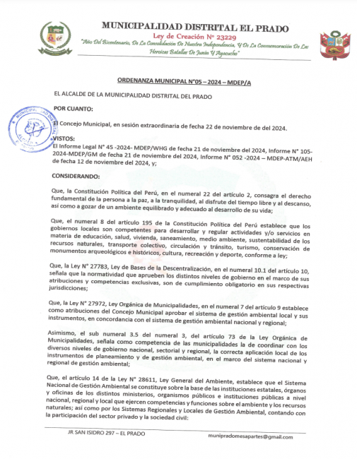 Ordenanza Municipal N° 005-2024-MDEP/A