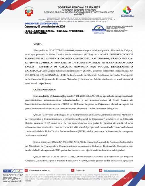 Resolución Gerencial Regional N° D49-2024-GR.CAJ/GRRNGMA