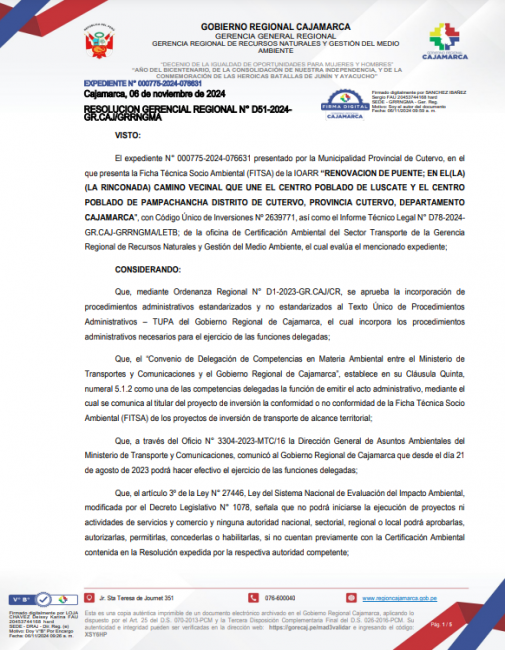Resolución Gerencial Regional N° D51-2024-GR.CAJ/GRRNGMA