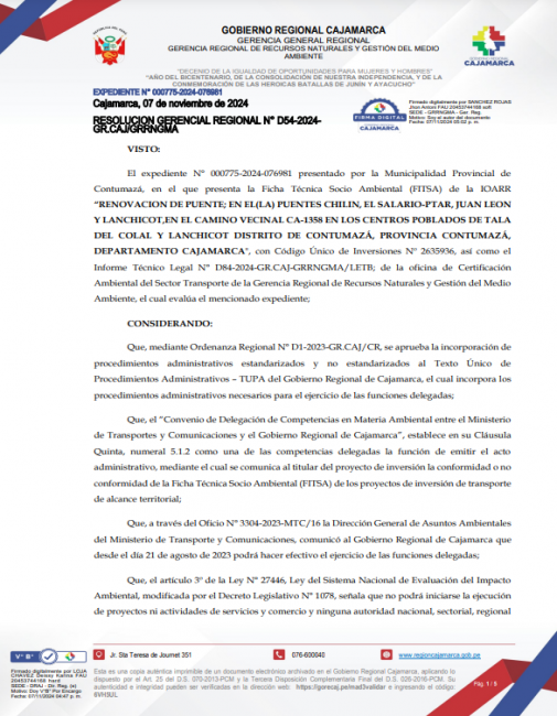 Resolución Gerencial Regional N° D54-2024-GR.CAJ/GRRNGMA